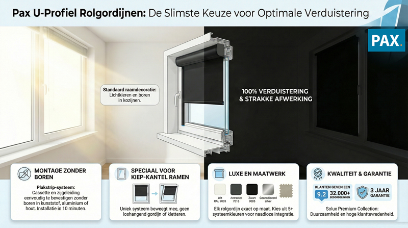 Het rolgordijndoek valt in de u-profielen waardoor het mooi afgewerkt is, het doek wordt begeleid & bij de keuze voor verduisterende stof het maximaal donker is (minimale kieren).