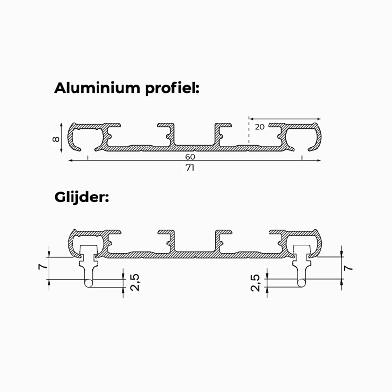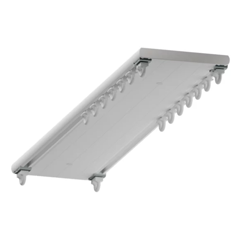 De rails wordt geleverd inclusief runners, begin- en eindstop. De runners en begin- en eindstop moeten nog op de rails worden gemonteerd. De dubbele rails heeft voorgeboorde gaten ter bevestiging aan plafond.
