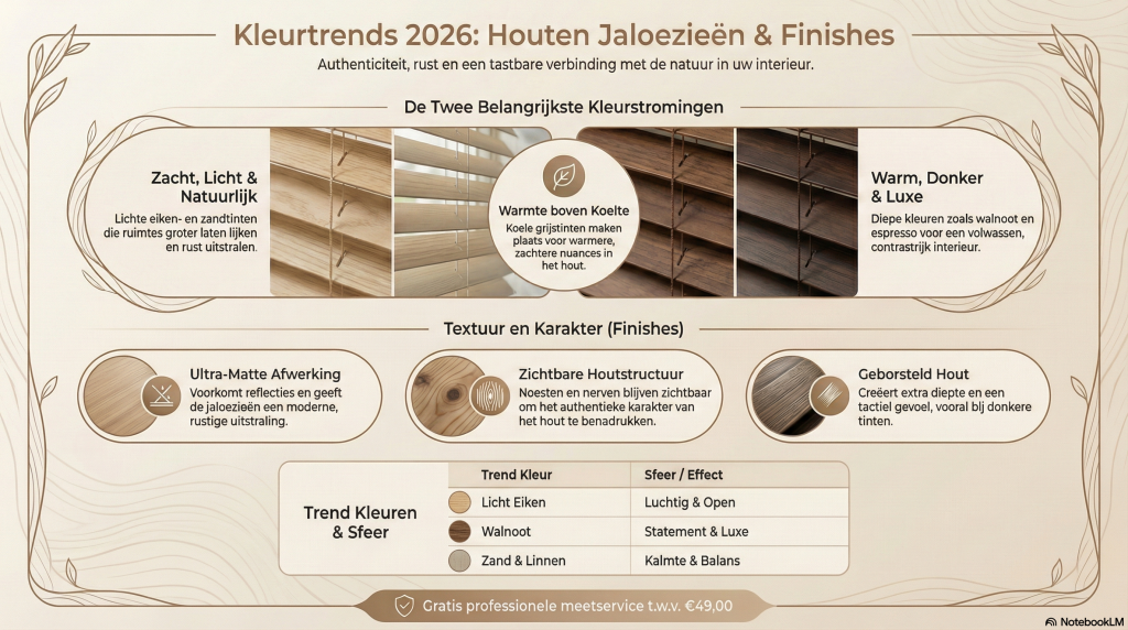 Hoewel hout altijd centraal staat, zijn er in 2026 twee duidelijke richtingen te herkennen binnen de kleurtrends voor jaloezieën: