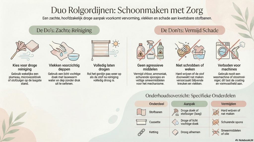 Een duo rolgordijn schoonmaken vraagt om een voorzichtige aanpak. Droog reinigen of licht vochtig deppen is meestal voldoende. Vermijd vooral veel water, agressieve middelen en hard schrobben. Zo blijft uw raamdecoratie op maat netjes in uitstraling en werking.