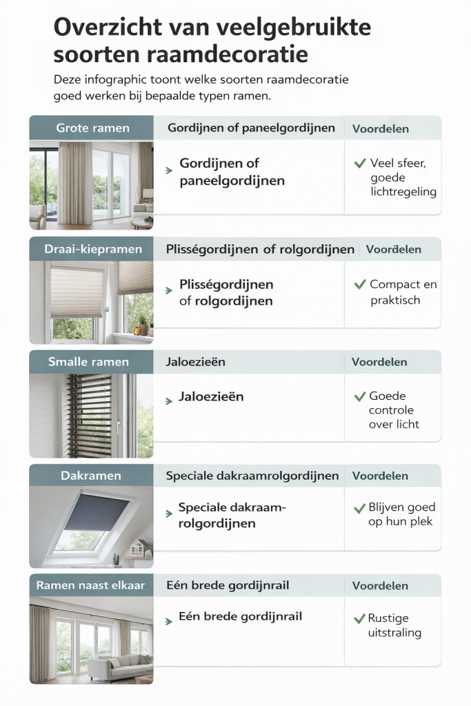Niet elk raam heeft dezelfde functie. Een groot raam in de woonkamer vraagt om andere raamdecoratie dan een klein raam in een hal. Daarom is het belangrijk om per raamtype te kijken welke oplossing het meest praktisch is.