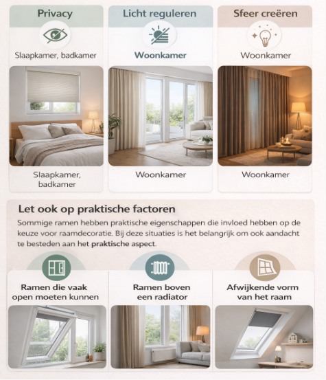 Daarnaast spelen praktische factoren een rol. Denk aan ramen die vaak open moeten kunnen, ramen boven een radiator of ramen met een afwijkende vorm. Niet elke soort raamdecoratie werkt in elke situatie even goed.
