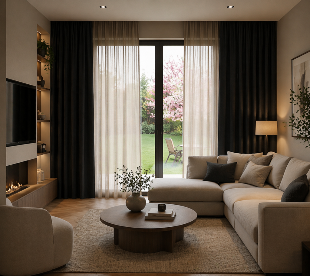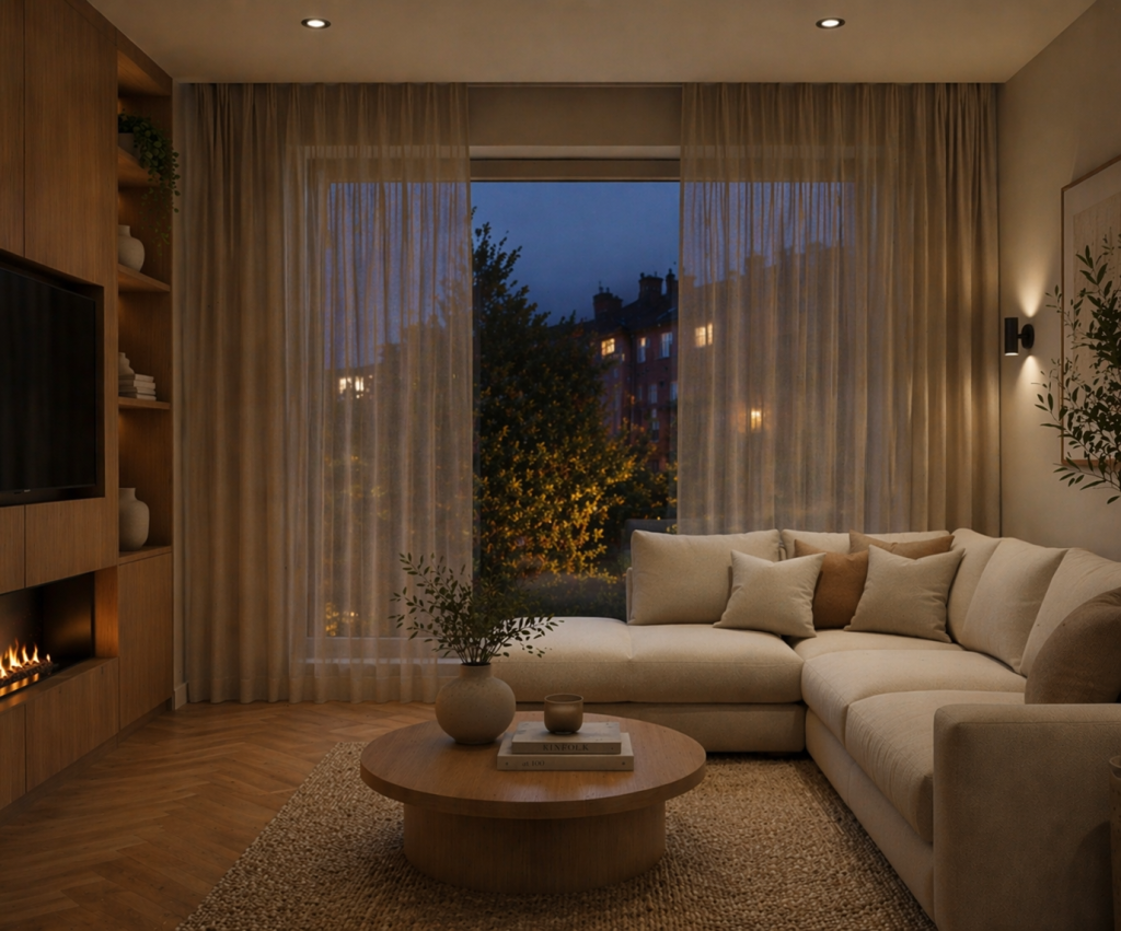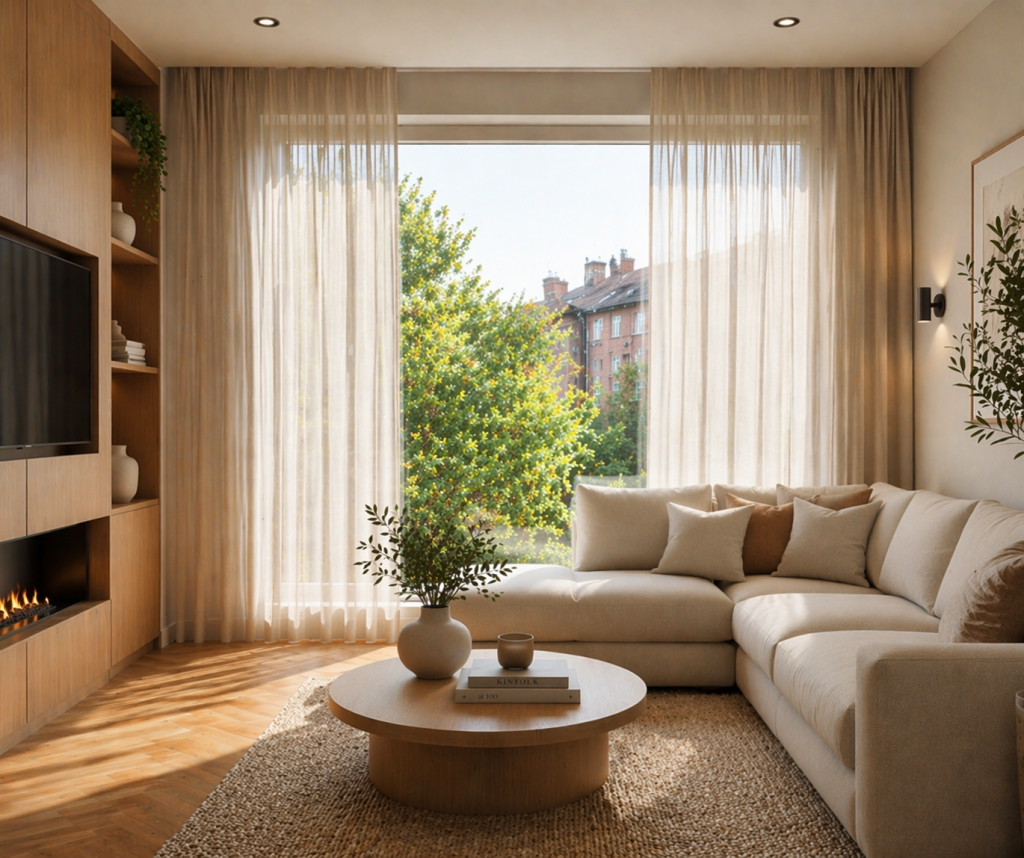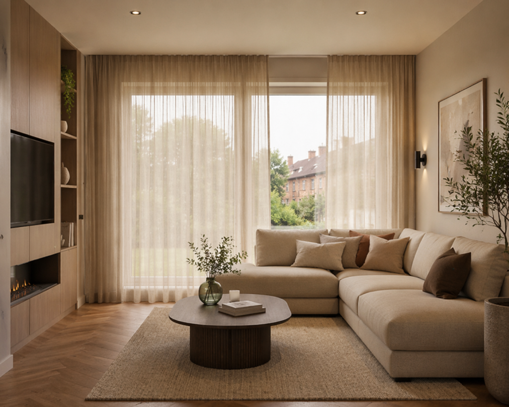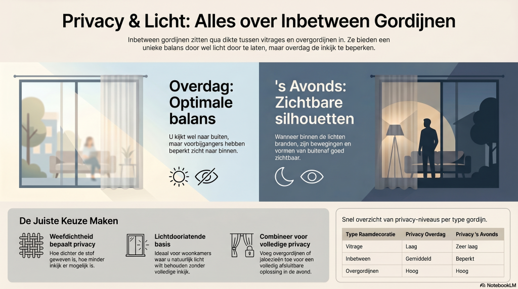 Inbetween gordijnen bieden goede privacy overdag, maar beperkte privacy in de avond. Ze zijn vooral geschikt als stijlvolle, lichtdoorlatende basis. Voor volledige privacy is een combinatie met andere raamdecoratie aan te raden.