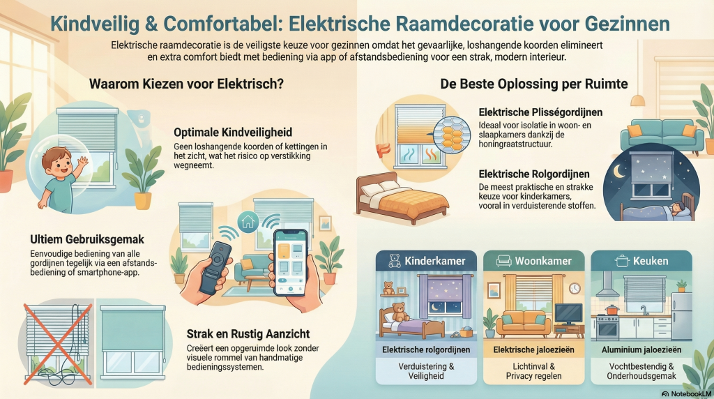 Elektrische raamdecoratie is voor gezinnen een veilige en comfortabele oplossing. Vooral plisségordijnen, rolgordijnen en jaloezieën zijn populair. Met raamdecoratie op maat kiest u voor een nette afwerking en een oplossing die past bij uw woning.