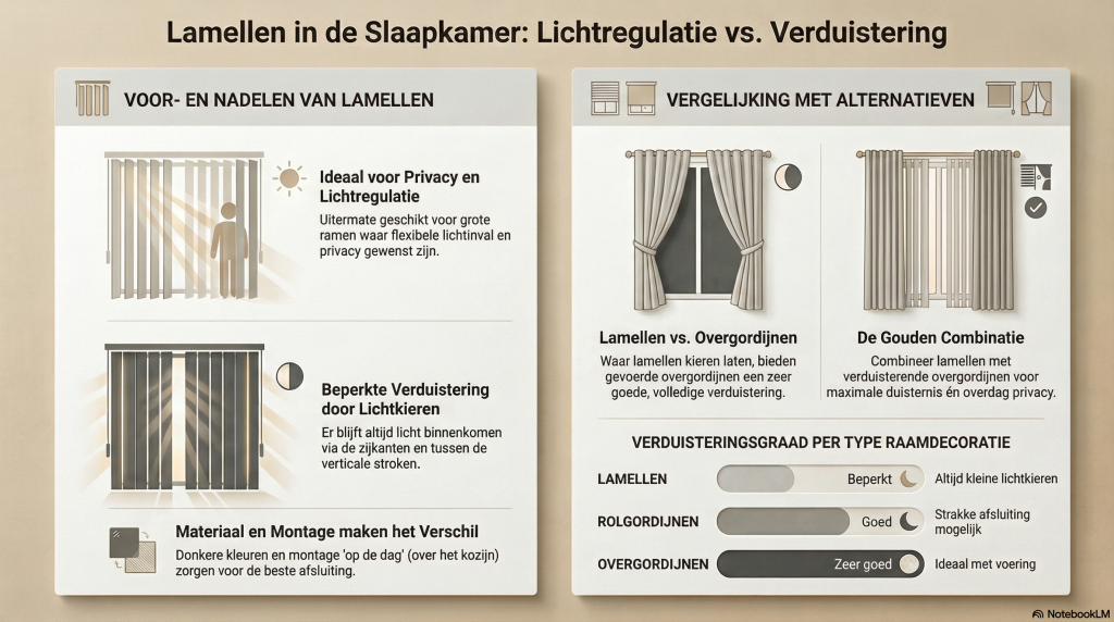 Lamellen zijn functioneel en stijlvol, maar bieden geen volledige verduistering. Ze zijn vooral geschikt voor lichtregeling en privacy, niet voor een volledig donkere slaapkamer.