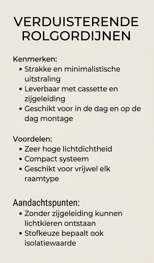 | Verduisterende rolgordijnen | Zeer hoog | Gemiddeld | Slaapkamers, zolders |