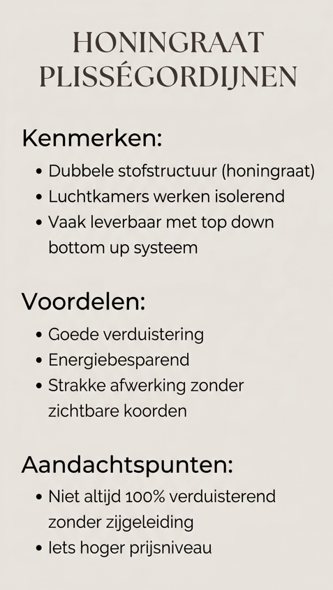 | Plisségordijnen | Hoog | Hoog | Energiebesparing |