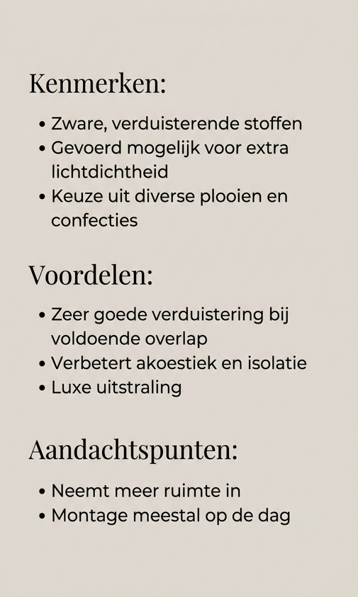 | Overgordijnen | Hoog | Hoog | Sfeer en extra isolatie |
