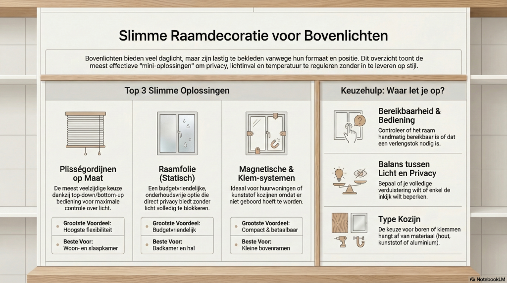 Bovenlichten hoeven geen lastig element in je interieur te zijn. Met de juiste mini-oplossingen maak je er juist een functioneel en stijlvol onderdeel van je woning van. Of je nu kiest voor praktisch, budgetvriendelijk of luxe: er is altijd een passende oplossing die aansluit bij jouw wensen en woonstijl.