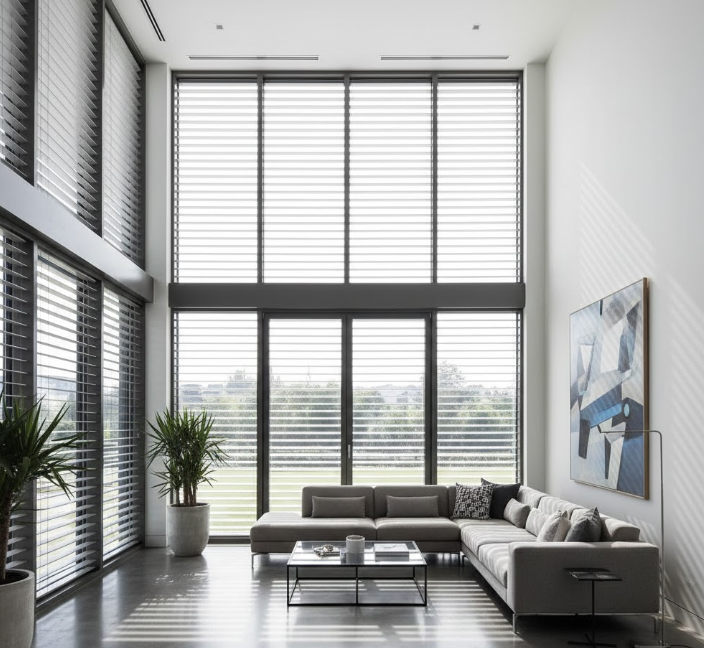 Bij hoge plafonds werkt het vaak goed om verticaliteit te benadrukken. Lange lijnen zorgen ervoor dat de ruimte rustig en stijlvol blijft. Denk aan gordijnen die van plafond tot vloer lopen of jaloezieën die exact de hoogte van het raam volgen. Tegelijk kun je met horizontale elementen – zoals vouwgordijnen of brede lamellen – juist wat zichtbare rust aanbrengen als de ruimte té hoog of kil aanvoelt.