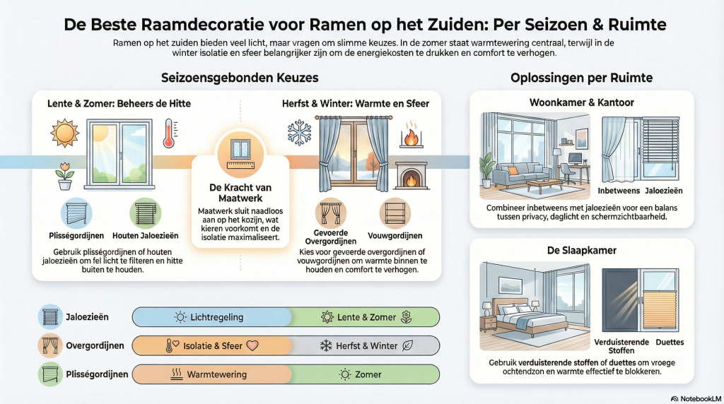 Ramen op het zuiden zorgen voor veel daglicht. Dat is prettig, maar stelt ook eisen aan uw raamdecoratie. In de zomer kan de warmte snel oplopen. In de winter wilt u juist profiteren van zonnewarmte en extra isolatie. De juiste raamdecoratie op maat helpt u daarom het hele jaar door met lichtregeling, comfort en energiebesparing.