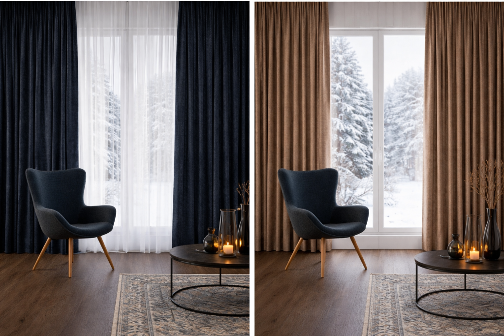 | Winter | Warmte vasthouden en comfort verhogen | Overgordijnen, combinatie met inbetweens |