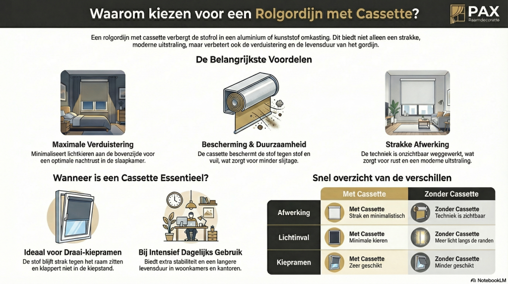 Vooral bij verduisterende stoffen is een cassette vaak essentieel voor een optimaal resultaat.