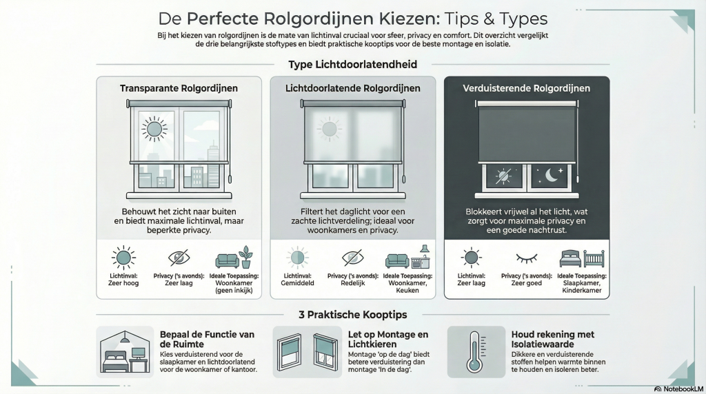 Bij het kiezen van rolgordijnen op maat speelt de lichtdoorlatendheid een belangrijke rol. De juiste keuze bepaalt niet alleen de sfeer in uw ruimte, maar ook het comfort, de privacy en de functionaliteit.