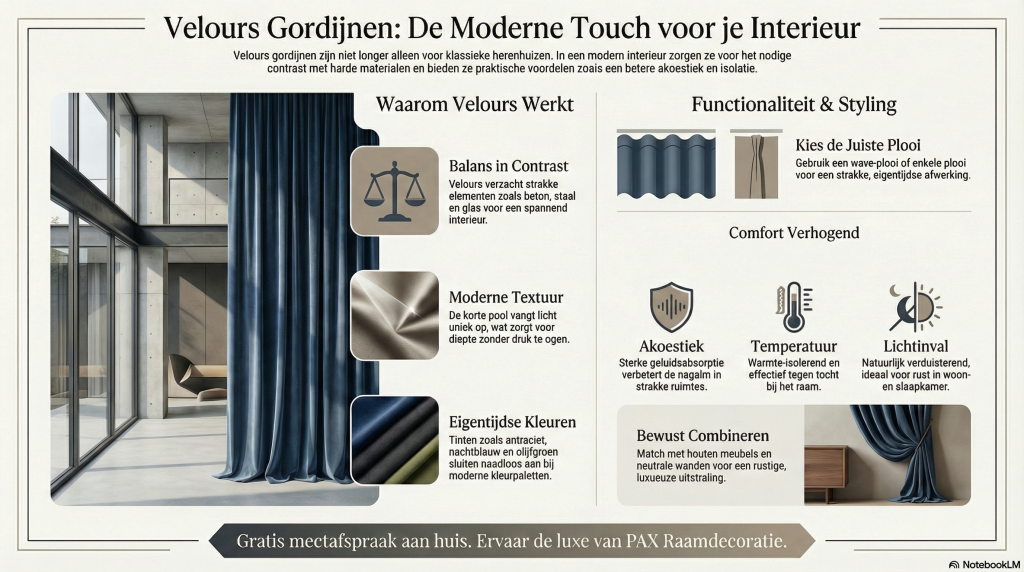 Met de juiste afwerking, kleur en toepassing bewijzen velours gordijnen dat modern en luxe uitstekend samen kunnen gaan. Het is geen stijlbreuk, maar een slimme manier om een modern interieur aangenamer te maken.