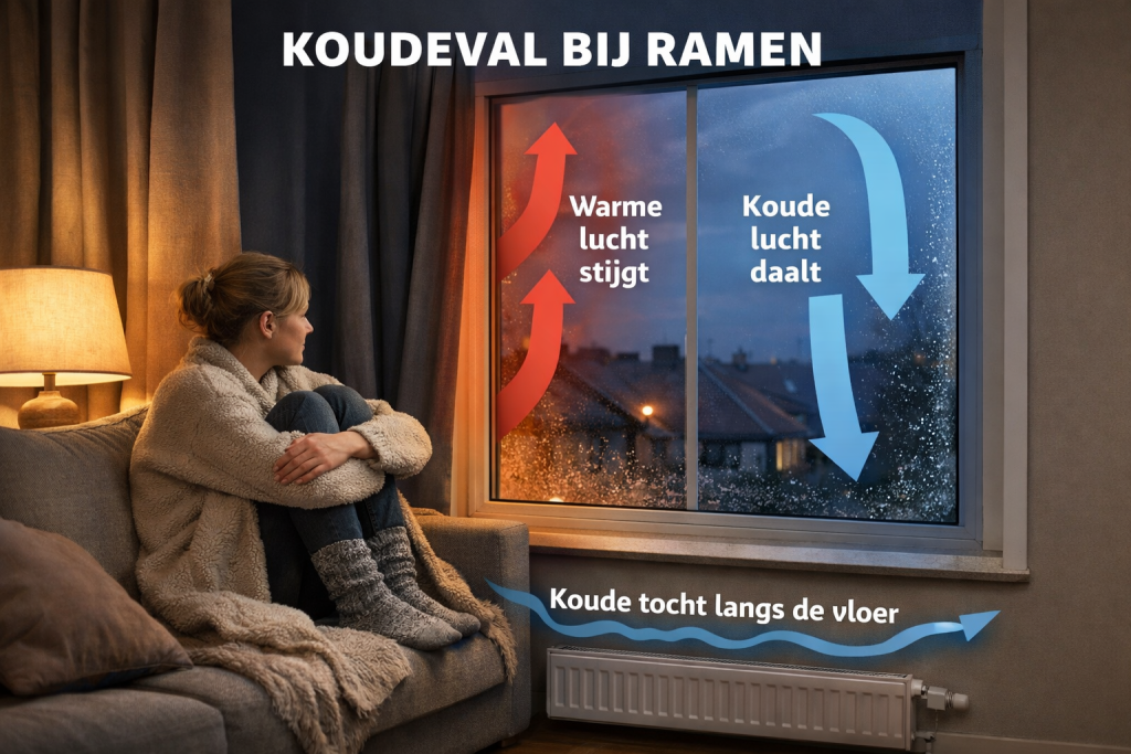 Dat gevoel zit niet tussen je oren. Het heeft te maken met hoe lucht zich gedraagt rond ramen. En dat merk je vooral wanneer je stil zit en je lichaam geen extra warmte aanmaakt.