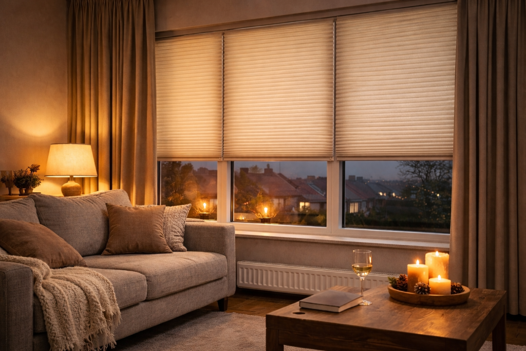 Honingraat plisségordijnen zijn extra effectief doordat ze lucht vasthouden in kleine kamers in de stof. Die stilstaande lucht werkt als een isolerende buffer.