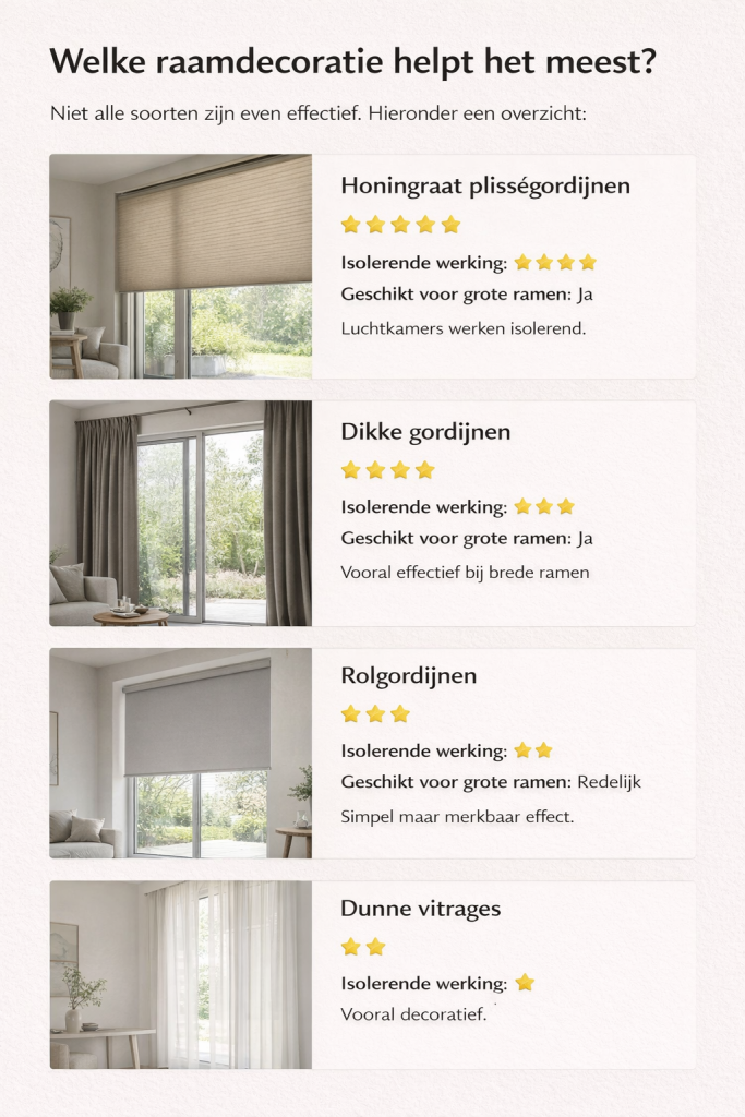 Raamdecoratie kan koudeval verminderen doordat het een extra laag vormt tussen het koude glas en de warme kamer. Die laag remt de luchtbeweging langs het raam af. De koude lucht zakt minder snel de ruimte in en de temperatuur in de kamer voelt gelijkmatiger aan.
