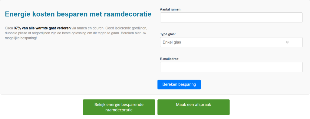 Bij PAX Raamdecoratie krijgen we hier vaak vragen over. “Helpt isolerende raamdecoratie nou echt?” of “Scheelt dat wel genoeg op de energierekening?” Daarom hebben we een tool gemaakt waarmee je dat zelf kunt berekenen. Geen ingewikkeld verhaal, gewoon een inschatting van wat je zou kunnen besparen als je kiest voor isolerende raamdecoratie.