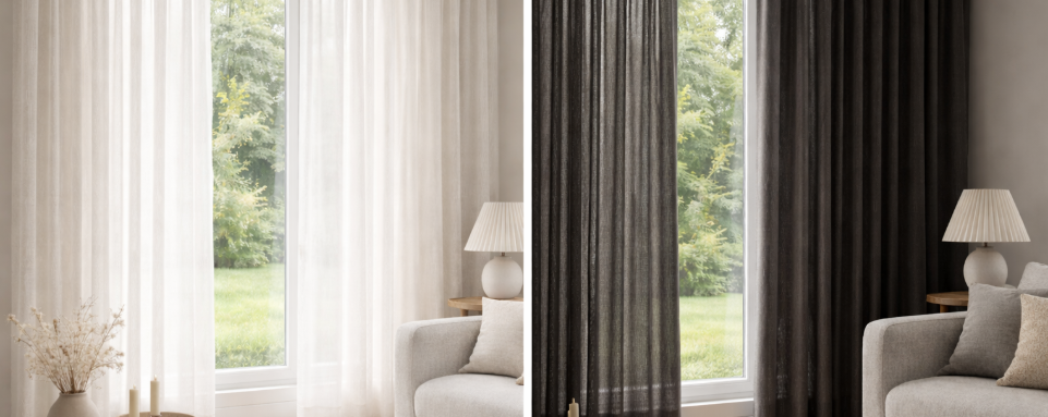 Niet alleen de kleur, maar ook het type raamdecoratie speelt een rol. Een lichte kleur in een luchtige stof geeft meestal het beste resultaat.