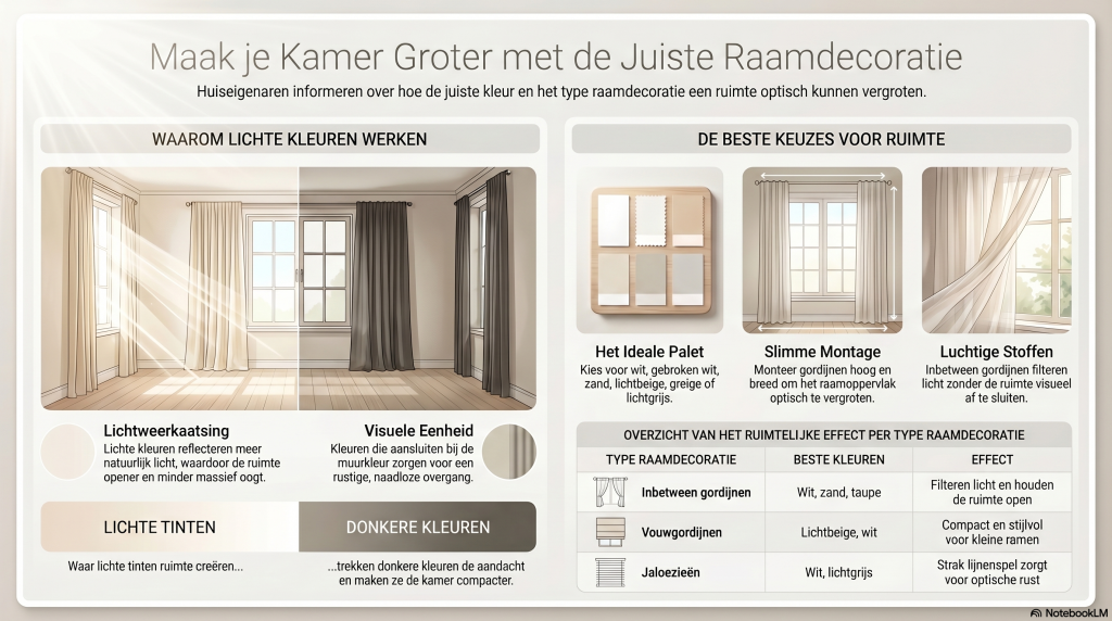 | Type raamdecoratie | Kleuren die een kamer groter laten ogen | Praktisch effect |