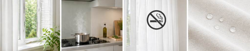 Voor keukens en badkamers zijn aluminium jaloezieën, vochtbestendige plisségordijnen of praktische rolgordijnen vaak onderhoudsvriendelijker dan gevoelige stoffen.