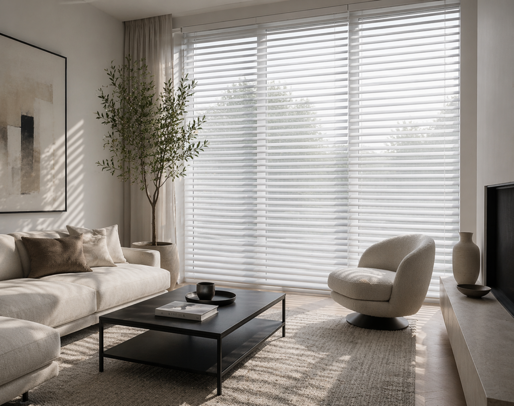 Witte jaloezieën van aluminium of hout zijn praktisch, maar tonen stof snel op de lamellen.