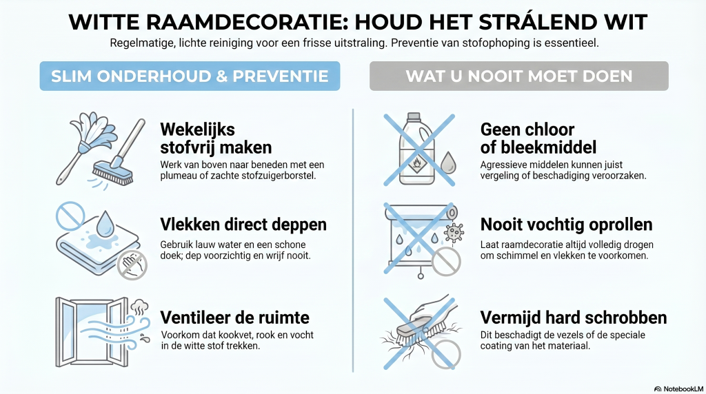 Witte raamdecoratie blijft het mooist met regelmatig, voorzichtig onderhoud. Wacht niet tot vervuiling zichtbaar is, maar werk met vaste onderhoudsmomenten. Zo behoudt u de frisse uitstraling van wit en blijft uw raamdecoratie op maat langer representatief.